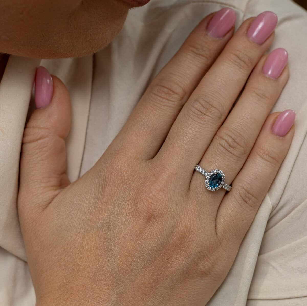 Δαχτυλίδι από λευκόχρυσο 18 καρατίων με μαγευτικό London Blue Topaz σε οβάλ κοπή, που αιχμαλωτίζει το βλέμμα με το βαθύ, ατμοσφαιρικό μπλε του χρώμα. Γύρω του, ροζέτα από lab grown brilliant-cut διαμάντια φωτίζει την πέτρα και δημιουργεί μια υπέροχη αντίθεση, ενώ η διαμαντένια διακόσμηση στη γάμπα προσθέτει ακόμα περισσότερη λάμψη σε κάθε κίνηση. Ο London Blue Topaz συμβολίζει τη γαλήνη και τη δύναμη, ενώ τα διαμάντια φέρνουν στο κόσμημα την αίσθηση της αιώνιας αγάπης. Ένα δαχτυλίδι που δεν είναι απλά στολίδι, αλλά υπόσχεση κομψότητας και αρμονίας για μια ολόκληρη ζωή.