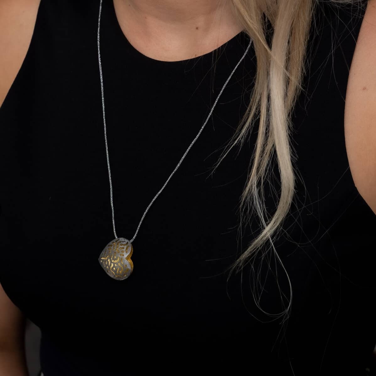 Κρεμαστό από ασήμι 925° σε ανθρακί απόχρωση, διακοσμημένο με φύλλο χρυσού 22 καρατίων. Το μοτίβο της καρδιάς ξεχωρίζει με την περίτεχνη διάτρητη διακόσμηση, που αποκαλύπτει τον χρυσό στο βάθος και δημιουργεί μοναδική αντίθεση με το σκούρο ασήμι. Ένα εντυπωσιακό κόσμημα με καλλιτεχνική αισθητική και διαχρονικό χαρακτήρα, ιδανικό για ιδιαίτερες εμφανίσεις. Συνοδεύεται από κορδόνι υψηλής αντοχής στο μήκος που επιθυμείτε.