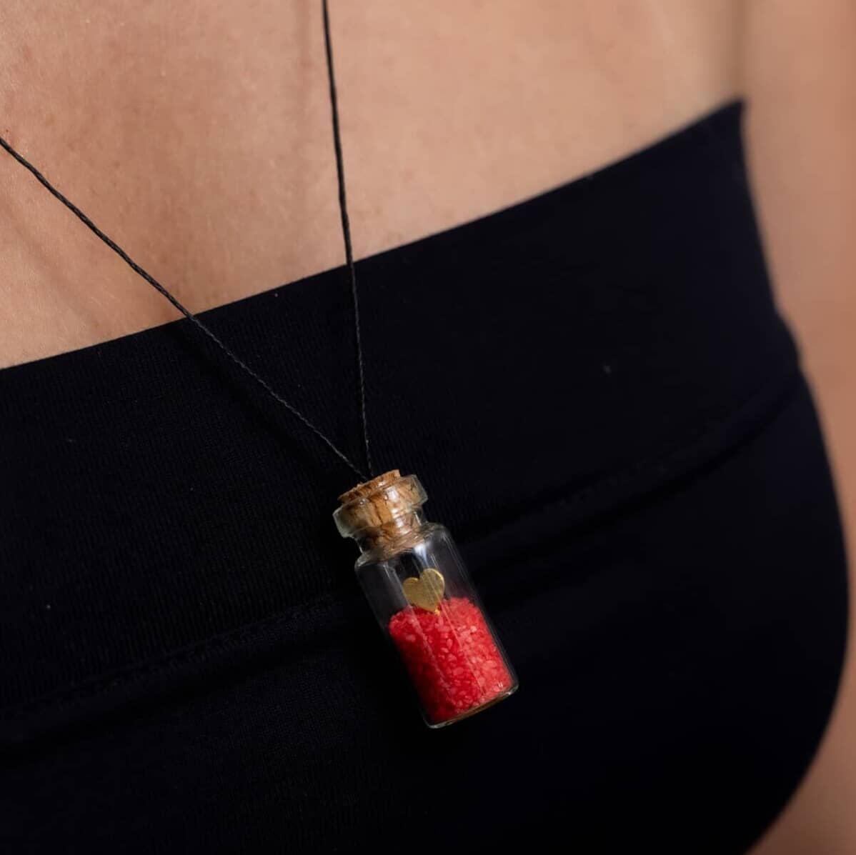 Κρεμαστό γυάλινο φιαλίδιο με κόκκινους ή μαύρους κρυστάλλους και διακοσμημένο με επίχρυσο σχέδιο σε σχήμα καρδιάς. Ένα χειροποίητο κόσμημα με παιχνιδιάρικη και ρομαντική διάθεση, που συνδυάζει την τρυφερότητα με τη μοναδικότητα του σχεδιασμού. Ιδανικό για όσους αγαπούν τα ιδιαίτερα και συμβολικά αξεσουάρ. Συνοδεύεται από κορδόνι υψηλής αντοχής στο μήκος που επιθυμείτε.