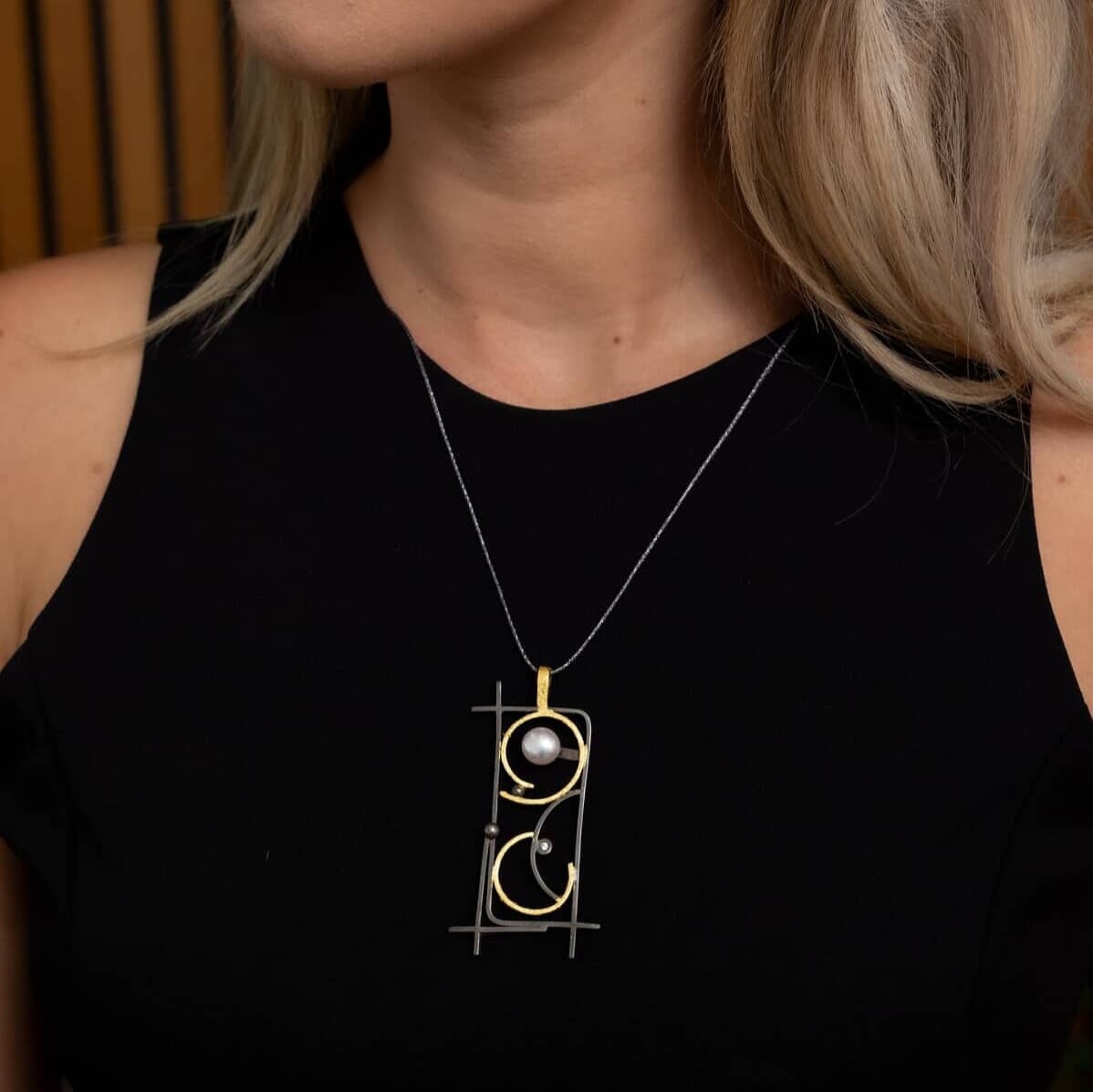 Κρεμαστό από ασήμι 925° σε ανθρακί απόχρωση, με λεπτομέρειες από φύλλο χρυσού 22 καρατίων. Ο γεωμετρικός σχεδιασμός του τονίζεται από το μαργαριτάρι και το ζιργκόν, δημιουργώντας ένα κομμάτι που συνδυάζει τη μίνιμαλ αισθητική με τη διακριτική πολυτέλεια. Χειροποίητο κόσμημα με σύγχρονο χαρακτήρα, ιδανικό για ξεχωριστές εμφανίσεις. Συνοδεύεται από κορδόνι υψηλής αντοχής στο μήκος που επιθυμείτε.