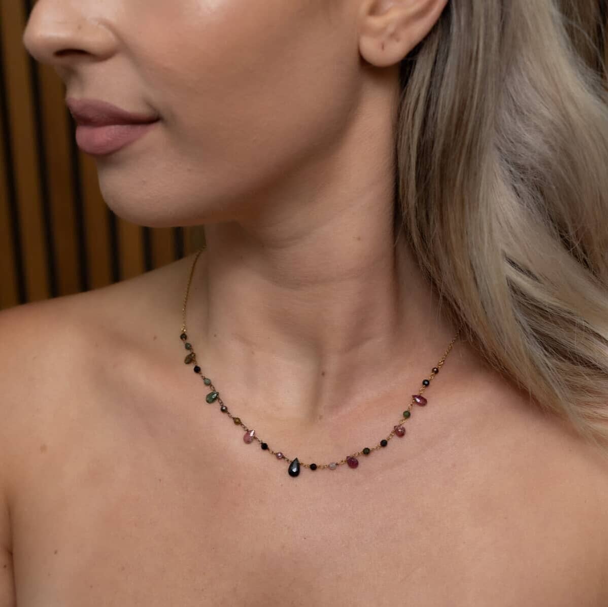 Κολιέ από ασήμι 925° με επιχρύσωση και πολύχρωμες ημιπολύτιμες πέτρες σε σχήμα σταγόνας και σφαιριδίων. Ο ζωντανός συνδυασμός χρωμάτων προσδίδει φρεσκάδα και κομψότητα, ενώ η λεπτεπίλεπτη αλυσίδα αναδεικνύει τη χάρη του σχεδίου. Χειροποίητο κόσμημα με προσεγμένο φινίρισμα, ιδανικό για να φωτίσει κάθε εμφάνιση με έναν διακριτικό αλλά ξεχωριστό χαρακτήρα. Ένα διαχρονικό κολιέ με γήινες αποχρώσεις που μπορείτε να το συνδυάσετε εύκολα με άλλα αξεσουάρ.
