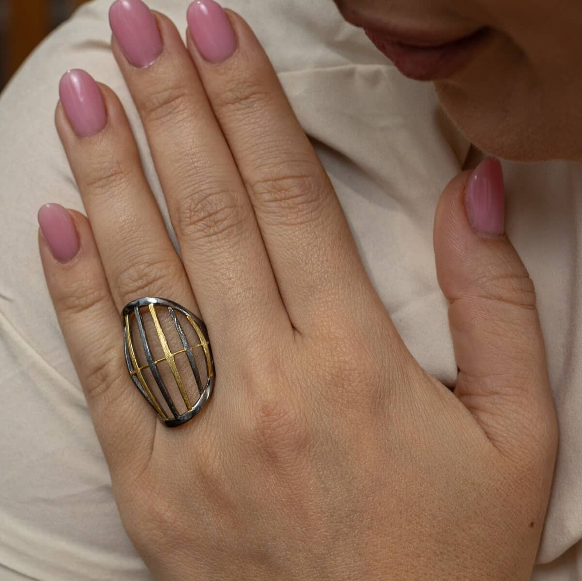 Μοντέρνο δαχτυλίδι, από ασήμι 925'. Ιδιαίτερο σχέδιο, με ασύμμετρο σχήμα, σχηματίζοντας ένα άκρως εντυπωσιακό δαχτυλίδι.