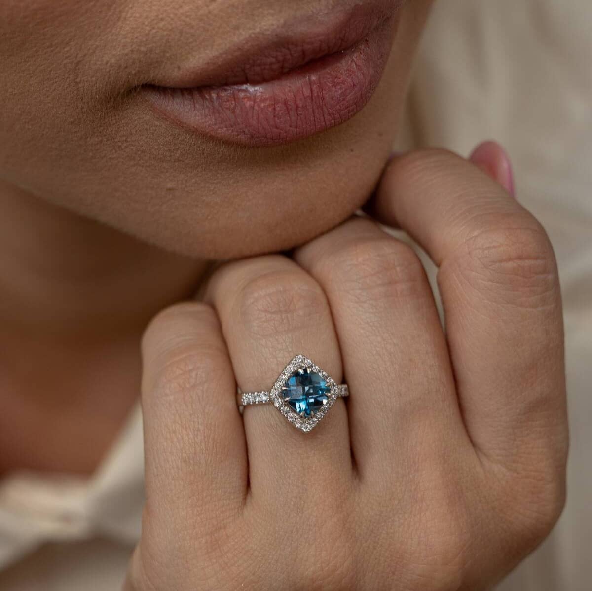 Δαχτυλίδι από λευκόχρυσο 18 Καρατίων με ροζέτα ένα ρομβοειδές London Blue Topaz και brillant. Ένα δαχτυλίδι που ξεχωρίζει τόσο για τη συναρπαστική απόχρωση της κεντρικής πέτρας, όσο και για τη διαχρονικότητά του.