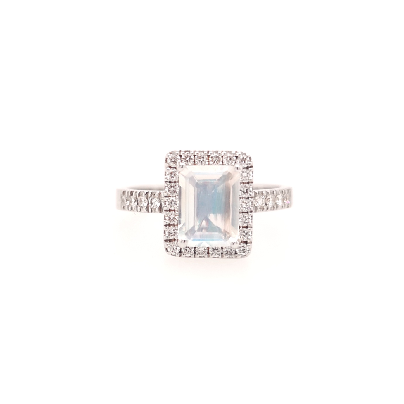 Δαχτυλίδι από λευκόχρυσο 18 καρατίων με ορθογώνια φεγγαρόπετρα που ακτινοβολεί απαλή, μαγική λάμψη. Η κεντρική πέτρα αγκαλιάζεται από αστραφτερά ζιργκόν, δημιουργώντας ένα κομψό και αριστοκρατικό σύνολο. Ιδανικό για όσες αναζητούν ένα κόσμημα γεμάτο ρομαντισμό, που αποπνέει φως και αρμονία σε κάθε εμφάνιση. Ένα δαχτυλίδι που με τη λάμψη του, μαγνητίζει το βλέμματα πάνω σας.