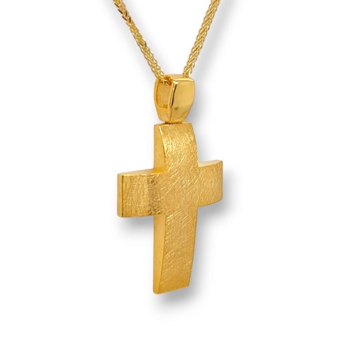 Μοντέρνος χειροποίητος σταυρός με ιδιαίτερη, ματ επιφάνεια. Ένα σχέδιο με απαλή καμπύλωση. Μία επιλογή που σίγουρα θα αρέσει καθώς είναι ένα σχέδιο διαχρονικό. Κατασκευασμένος από χρυσό 14 καρατίων, με καδένα υψηλής αντοχής, ενώ μπορούμε να τον κατασκευάσουμε και σε 18 καράτια.