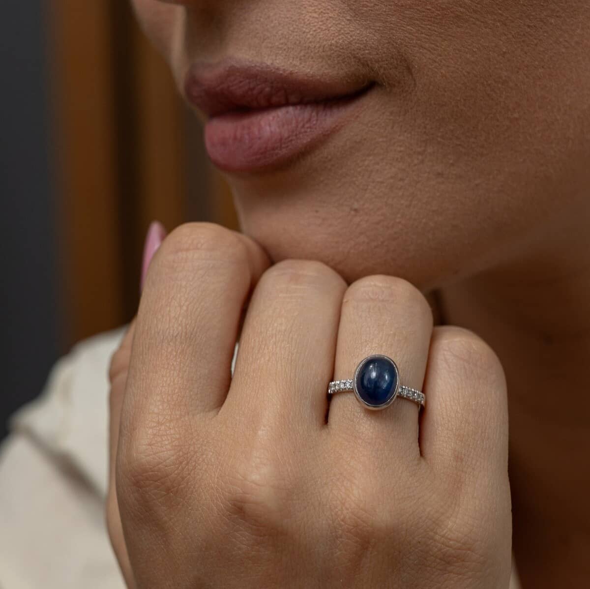 Ένα εκθαμβωτικό δαχτυλίδι από λευκόχρυσο 18 καρατίων που ξεχωρίζει για το εντυπωσιακό ζαφείρι καμπουσόν στο κέντρο του. Η απαλή, στρογγυλεμένη κοπή του ζαφειριού χαρίζει βάθος και μυσταγωγική λάμψη, δημιουργώντας μια αύρα διακριτικής πολυτέλειας. Οι διαμαντένιες λεπτομέρειες που αγκαλιάζουν το δαχτυλίδι ενισχύουν τη φωτεινότητά του, αποπνέοντας αρμονία και κομψότητα. Η ισορροπία ανάμεσα στο έντονο μπλε και την εκθαμβωτική λάμψη των διαμαντιών το καθιστά ένα κόσμημα που δεν περνά απαρατήρητο. Ένα δαχτυλίδι που ενώνει την κλασική φινέτσα με τη διαχρονική γοητεία, ιδανικό για γυναίκες που αγαπούν τη μοναδικότητα.
